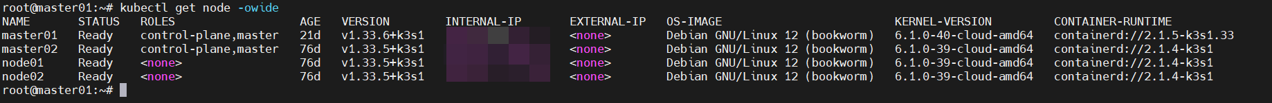 curl -sfL https://get.k3s.io | K3S_URL=https://k3s_api.domain.com:6443 K3S_TOKEN=xxxxx::server:xxxxxx sh -最后在任意master上查看节点状态